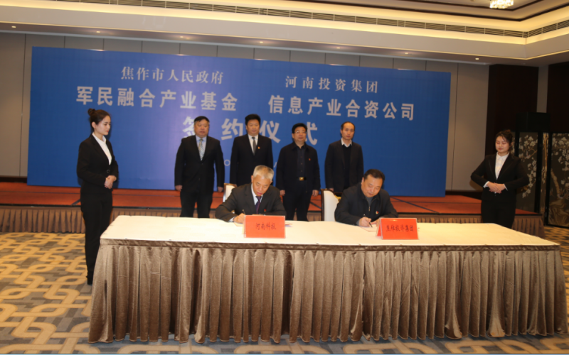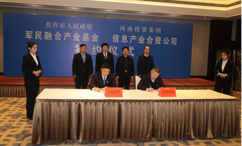 1月9日上午,集团公司代表市人民政府与河南投资集团合作设立军民融合产业基金、成立信息产业合资公司的签约仪式在焦作迎宾馆举行。市委副书记、市长徐衣显,河南投资集团党委书记、董事长刘新勇出席并致辞。市委常委、常务副市长李民生,副市长孙起鹏,河南投资集团副总经理李兴佳一同出席。集团公司董事长邹仲春、总经理王敏分别代表市政府与省投资集团相关下属公司进行签约。
