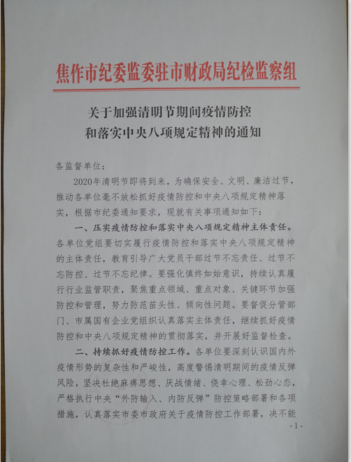 焦作市纪委监委驻市财政局纪检监察组关于加强清明节期间疫情防控和落实中央八项规定精神的通知